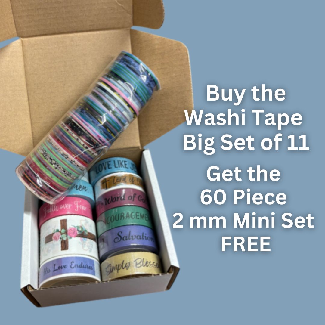 We now have 11 (Eleven) unique rolls of Scriptural Accents Washi Tape that feature carefully selected verses from the Bible, popular hymns, and uplifting messages that are perfect for adding a touch of inspiration to your journal pages and Bible study notes. These tapes are not just for decoration, but they can also serve as a powerful tool to emphasize an important passage or message.