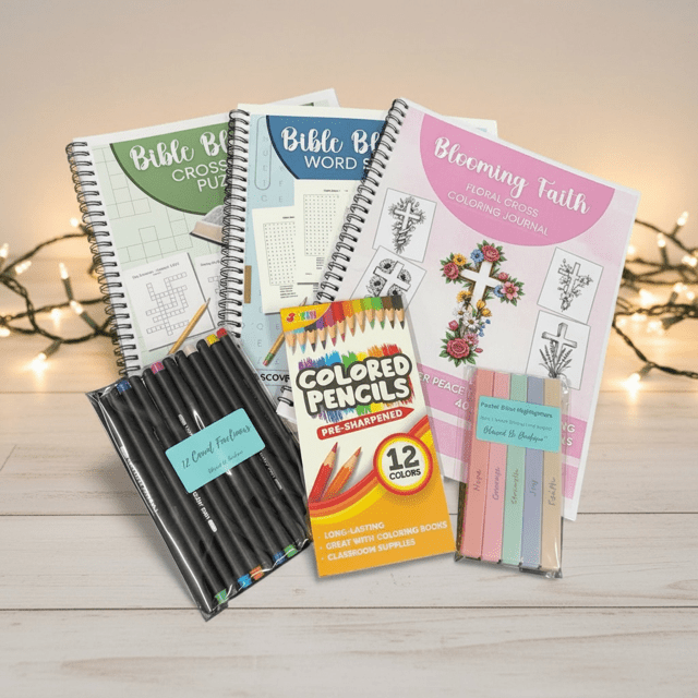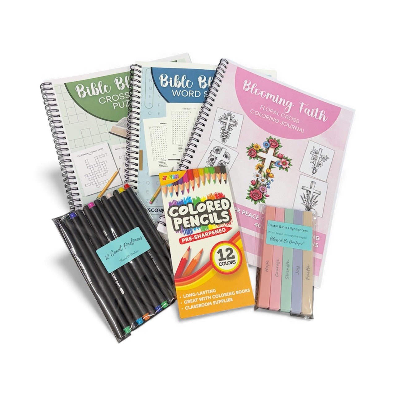 Bring a little joy and creativity into your quiet time! This bundle includes our Blooming Faith Coloring Journal, Bible Blessings Word Search, Bible Blessings Crossword Puzzle Journal, plus a full set of highlighters, coloring pencils, and Bible Highlighters. It’s everything you need for a peaceful, faith-filled moment to unwind, color, and stay connected to God’s Word. A fun and meaningful gift for anyone who loves to create.