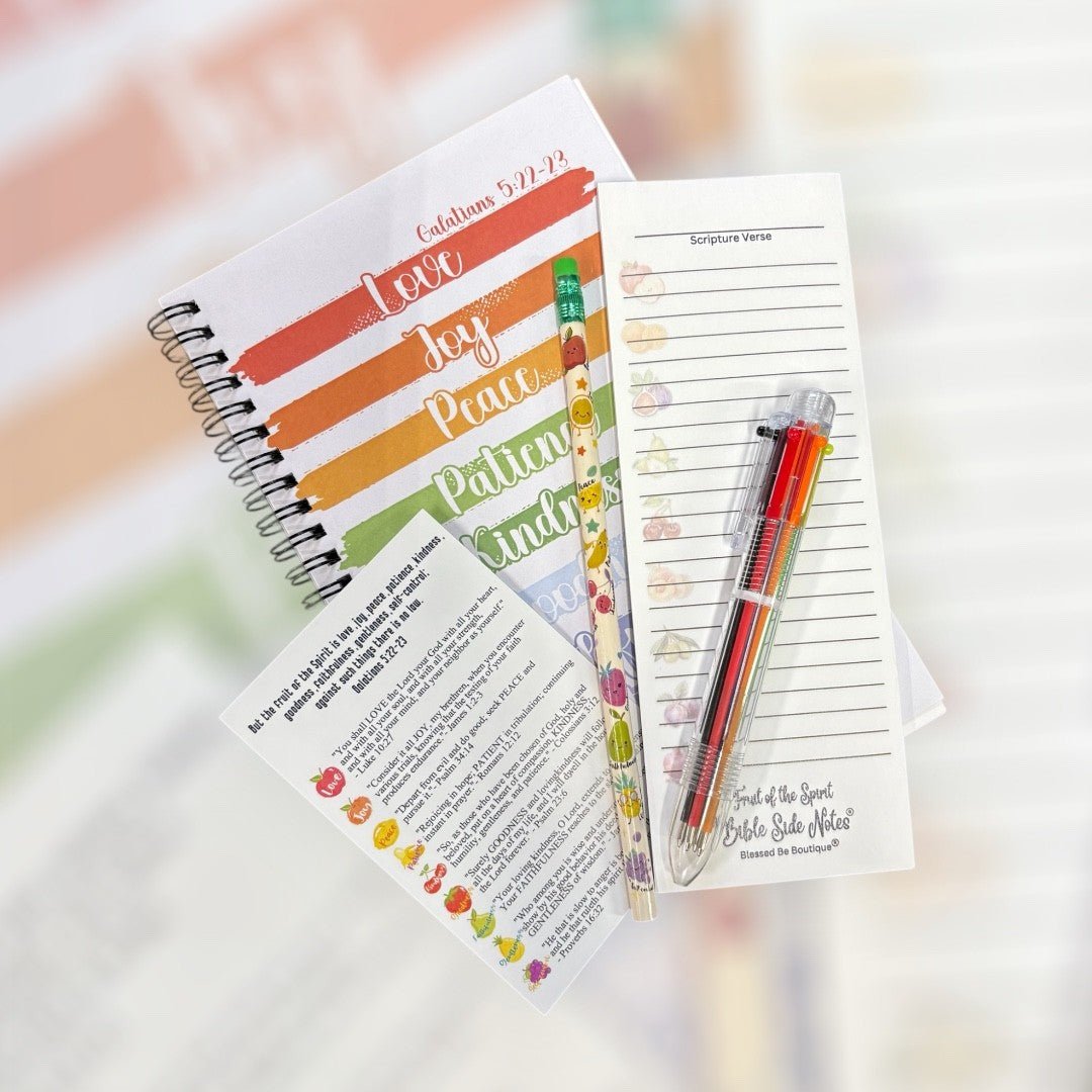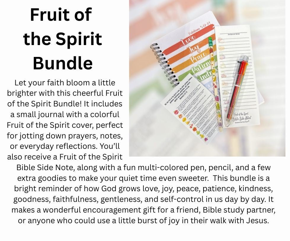 Let your faith bloom a little brighter with this cheerful Fruit of the Spirit Bundle! It includes a small journal with a colorful Fruit of the Spirit cover, perfect for jotting down prayers, notes, or everyday reflections. You’ll also receive a Fruit of the Spirit Bible Side Note, along with a fun multi-colored pen, pencil, and a few extra goodies to make your quiet time even sweeter.
