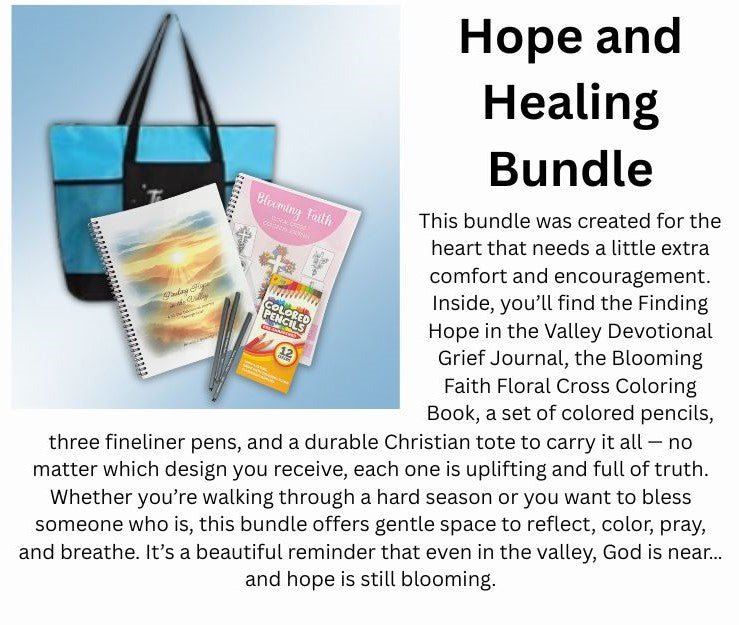 This bundle was created for the heart that needs a little extra comfort and encouragement. Inside, you’ll find the Finding Hope in the Valley Devotional Grief Journal, the Blooming Faith Floral Cross Coloring Book, a set of colored pencils, three fineliner pens, and a durable Christian tote to carry it all — no matter which design you receive, each one is uplifting and full of truth.
