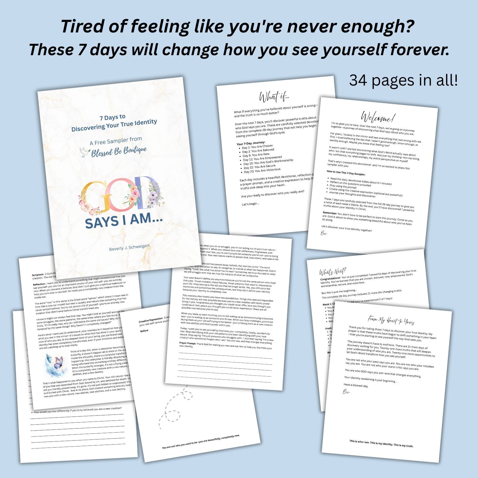 This 7-day mini devotional gives you a powerful taste of the complete 28-day "God Says I Am" experience. Carefully selected from all four weeks of the full journey, these devotions will help you begin seeing yourself through God's eyes.